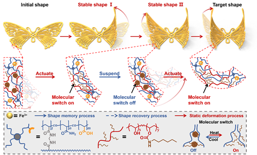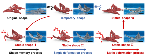 进一步地,为了增强对形状的调控,研究人员在上述凝胶体系中加入具有光热特性的Fe3O4纳米颗粒,从而获得了具有光热特性的PVA-C6凝胶。得益于凝胶的光热特性,当红外激光照射到凝胶表面时,随着凝胶温度的上升,PVA-C6凝胶中的疏水团簇会被打开使得凝胶自发地从直条变成弯曲形状。并且在变形的过程中,当撤去红外激光时,凝胶的温度会迅速降低并快速诱导短链烷烃重新形成团簇从而中止变形过程,使得凝胶停留在变形过程的中间形态。基于这种静态变形的行为,通过程序化控制外界红外激光,蝴蝶状的凝胶就可以任意地控制两个翅膀挥动的角度和次序,从而在一次变形过程中展示出多种形态特征(图3)。
