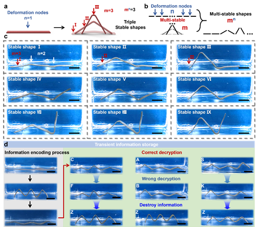 为了强化凝胶在一个变形过程中展示的形态特征,该团队进一步提出了“变形节点”的概念,即将条形凝胶在第一次的形状记忆过程中被弯曲的节点数记为n,而将一个变形节点在受到光照回复的过程中表现出的瞬态形态数记为m。对于一个条形凝胶而言,其通过不同变形节点的排列组合理论上能产生nm数的形态,这些不同的形态可被逐一编码、对应不同的信息。因此,经过此种方式加密后,在nm个形态中只有一种光照解密的方式才能展示出正确的形态,从而获得正确的密码(图4)。值得一提的是,当凝胶条中的密码被正确解密后,将凝胶条置于热水中,其展示的形态信息还可被快速掩藏实现阅后即焚。除此之外,当将一维的变形节点延伸到二维后,一个凝胶所能产生的形态数将进一步地被扩展为nm*nm。并且对于同一个目标形状而言,会产生不同的解锁路径。在众多解锁路径所产生的数字编码中,只有唯一的编码组合能得到正确的信息。因此,该凝胶可以像手语一样,通过不断变换形态,持续地输出形态信息组成正确的字符串,最终传递出完整的信息(图5)。