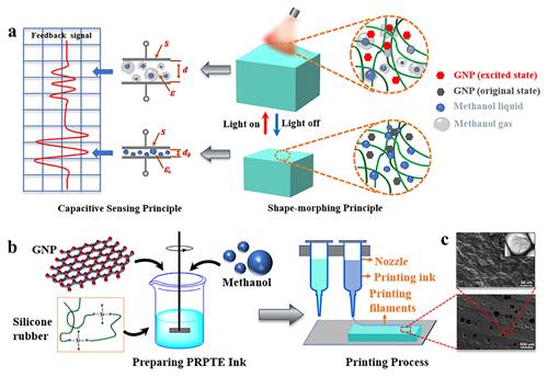 针对上述问题,5630福彩网增材制造材料技术团队程昱川研究员和孙爱华研究员基于石墨烯、低沸点溶液微滴和硅橡胶,制备了一种集成变形驱动和传感特性于一体的光响应液-气相变弹性体(PRPTE)(如图1)。PRPTE具有优异的机械性能,在100℃时,低沸点发生液-气相变产生的轴向力可以高达自身重量的400倍,且稳定性良好。以该材料为主动层材料,团队采用4D打印技术制备了一系列柔性执行器,实现弯曲、抓取和爬行等光控程序化运动(如图3)。