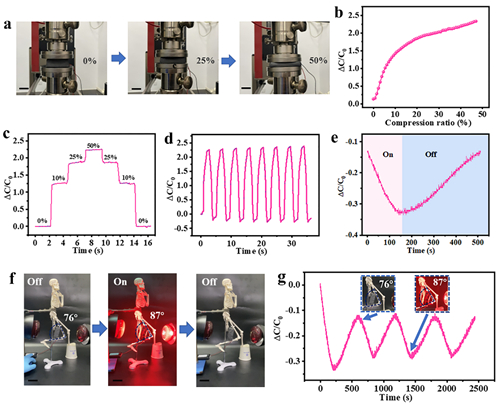 尤其重要的是,基于电容变化PRPTE表现出自传感特性。石墨烯吸收近红外光产生热量,低沸点液体发生液-气相变,介电常数减小;石墨烯因硅橡胶膨胀而逐渐分散,弹性体介电常数减小;同时电极间距增大。在以上三个因素的共同作用下,PRPTE的电容会迅速减小,从而实现对其变形的实时感知。模仿生物体利用其自身信号反馈调节肌肉收缩和拉伸,从而进行复杂运动,团队制备了一种人工肌肉(如图2)。该人工肌肉可以通过反馈的电容值得知腿部弯曲角度,并根据需要的角度进行精确控制。该研究实现了柔性执行器的驱动/传感一体化功能集成,为设计和制造具有集成自感知能力的软机器人提供了新思路。
