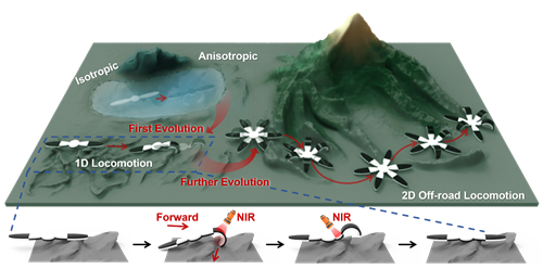 智能变形水凝胶作为一种软、湿态智能材料,能在外界环境的刺激下将自身化学能转化为机械能,同时伴随体积及形态的转变,因此一直以来被认为是理解与验证生物变形的理想平台。经过多年的发展,智能变形水凝胶已然能模仿自然界中的大部分变形行为,并展现出多刺激响应、可编程、程序化形态转变等诸多特点。然而,自然界的生命体不仅能改变自身形态,还可将这种原位的变形高效地转化为运动,从而满足自身示警、捕食及避险等需求。因此如何模仿生命体的运动行为,并进一步使智能变形水凝胶实现越野运动依然是一个巨大的挑战。