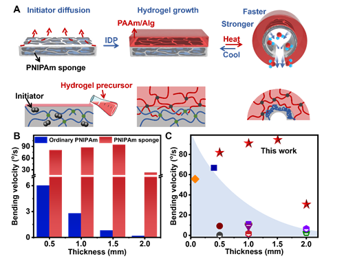 为了能实现高效的变形-运动转变,研究人员利用冰模板的方法,制备了具有超快温度响应的聚N-异丙基丙烯酰胺(PNIPAm)凝胶海绵。其可在5s内收缩到自身体积的40%,并且由其制备而得的双层水凝胶驱动器展示出88°/s的快速弯曲变形(图2)。值得一提的是,与传统的智能变形材料通过减小自身厚度来加快响应速度的方式不同,即使该凝胶厚度增加到2mm,其驱动速度也不会有较大损失。因此,在保证凝胶驱动变形速度的同时,PNIPAm凝胶海绵能具有更大的体积从而能将自身更多的化学能转化为机械能。