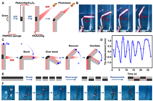 进一步地,为了增强凝胶变形的可控性,研究人员基于凝胶结构设计以及IDP策略,通过在PNIPAm凝胶海绵的表面定制化地生长含有Fe3O4纳米颗粒的光热凝胶,使得所制备的双层水凝胶驱动器能在近红外(NIR)光驱动下产生向光性及自持振动行为(图3)。除此之外,研究人员还可通过IDP策略,将制备好的双层水凝胶驱动器切断并重新排序组装,从而实现在NIR光下的多自由度程序化变形。