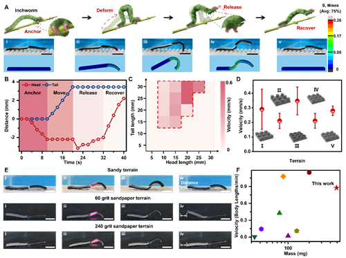 基于凝胶的程序化变形,这种双层的水凝胶驱动器能通过模仿自然界中尺蠖爬行的过程,利用时空调控的原位变形与环境的交互来实现高效的爬行运动。具体而言,一束NIR光首先照射的凝胶的头部,由于Fe3O4纳米颗粒的光热作用与PNIPAm凝胶海绵的热响应形变的协同作用,凝胶头部快速弯曲变形,并与粗糙基底形成卯榫结构增大其与基底的摩擦力。而后,NIR逐步移向凝胶中部,并不断触发所经凝胶的热弯曲收缩,使得凝胶整体收缩前进。当NIR移动到凝胶尾部时,对称相反的结构使得凝胶尾部凝胶向上弯曲从而抬起凝胶头部,使得其与基底的卯榫结构打开,解除锚定作用。最后,当移除NIR光后,头部的凝胶会快速回复到初始状态从而触发下一次循环。因此水凝胶也可在这种动态的卯榫锚定模式下,实现持续地爬行过程(图4)。值得一提的是,利用这种动态的卯榫锚定模式,该双层水凝胶驱动器可以适应多种粗糙表面,甚至可在普通的自然沙地上实现快速爬行。