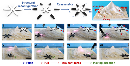 此外,得益于IDP策略对凝胶结构的编程,双层水凝胶驱动器可进一步仿生进化出二维的六触手形态,通过水凝胶触手之间的互相配合实现快速的二维爬行。并且通过触手的程序化变形,水凝胶还可在爬行过程中不断调整自身体积,从而适应地形的变化,并成功穿越隘口,山谷以及山脊等一系列复杂地形(图5)。