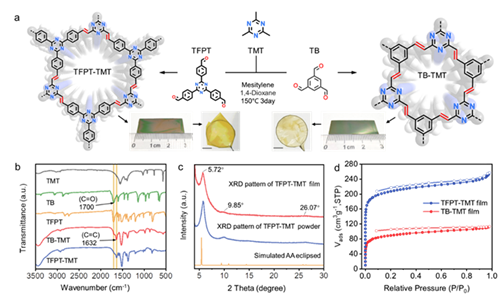 共价有机框架(COFs)材料是一类由重复有机单元通过共价键连接具有二维拓展结构的多孔晶体材料。该类材料具有高结晶度、均一孔径分布和高比表面积等特点,因此广泛应用在气体储存和分离、能源储存、光电催化等领域。其中二维sp2-碳共轭共价有机框架(sp2c-COFs)具有有序π堆叠、丰富活性位点、可调谐开放纳米孔道结构、可定制化分子构筑基元与强共价连接键等特点。并且得益于碳碳双键增强的π共轭电子跃迁、超高的化学/热稳定性及高电子迁移率等特性,sp2c-COFs的高效构建是半导体器件、能源催化、选择性分离膜等前瞻性新兴技术及苛刻环境领域内研究的热点。然而,sp2c-COFs的构筑受阻于高度不可逆的C=C成键过程;此外,目前报道的sp2c-COFs都是以粉末形式存在的,粉末的不溶性和共价有机薄膜制备困难的问题,阻碍了这些材料在相关分离膜、能源或光电器件中的应用。