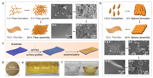 为了解sp2c-COF薄膜的形态演变,进一步收集了不同反应时间的样品,并通过扫描电镜对其进行了分析。已知2D COFs中的平面三嗪基团由于强的π-π相互作用有助于促进COF层沿z轴的垂直堆叠,从而导致结晶度增强并形成棒状或带状形态。因此,与三嗪基团较少的TB-TMT薄膜相比,TFPT-TMT薄膜中大量的三嗪基团倾向于形成更长的纤维。得益于表面引发技术可适用于多种基底的优势,sp2c-COF薄膜也可以在NH2-SAM修饰的其他各种基材上制备,包括聚丙烯腈(PAN)膜、玻璃纤维、铝片等。并且在PAN基底上制备的sp2c-COF薄膜尺寸可达18cm×7cm,为大面积制备sp2c-COF薄膜提供了新的途径(图4)。