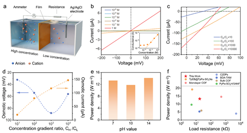 图5 sp2c-COF薄膜离子输运性质与海洋渗透能转换