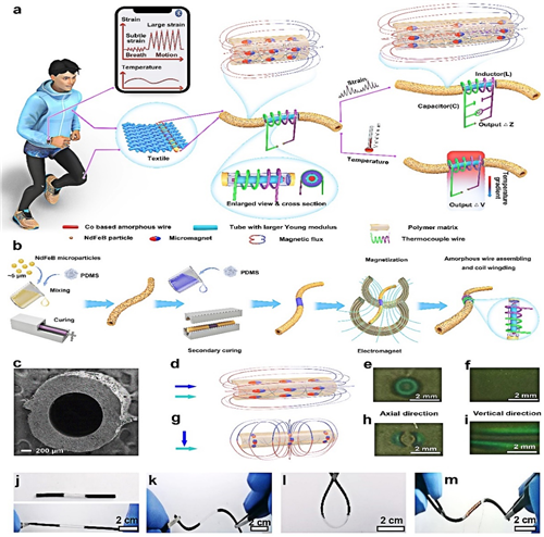 图1(a)双模传感器的感应机制,(b)具有管状异质结构的双模传感器传感器制备流程,(c)应变-磁转换单元中磁弹性管的微观形貌,(d-i)具有磁弹效应的磁弹性管不同磁化方向磁化具有不同的磁性能,(j-m)双模传感器外观和柔性展示