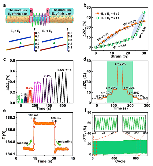 图2 双模传感器的应变感知性能