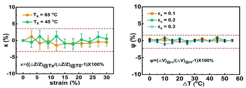 该研究中双模态传感器的应变-磁转换单元中具有磁弹效应的磁弹性体提供随应变而变化的磁场,通过内置的Co基磁性非晶丝,能够灵敏感知微小变化的磁场,从而输出变化的阻抗,实现应变的感知。此外,该工作巧妙地设计了具有双功能的Cu-CuNi热电偶线圈,不仅可以实现阻抗的输出,而且本身具有的塞贝克效应可以实现对温度的感知。进一步地,通过调控应变-磁转换单元的不同区域的相对模量,即磁弹性管和非磁性弹性管的相对模量,可以控制磁场变化快慢,从而能够实现应变灵敏度的可调。该传感器可实现0.05%的应变和0.1 ℃的低探测极限,5.29和54.9 μV/℃的较高应变和温度感知灵敏度。此外,该研究也从模拟和实验上对该双模传感器的应变-温度信号输出的耦合和相互干扰进行了验证。分别测试了双模传感器在不同应变下的温度输出信号和不同温度下的应变输出信号,发现该传感器具有的管状异质结构能够有效避免应变对温度的干扰,且磁性非晶丝和磁粉的磁性能在低于居里温度下具有的良好的温度稳定性可以确保温度对应变感知几乎没有影响。