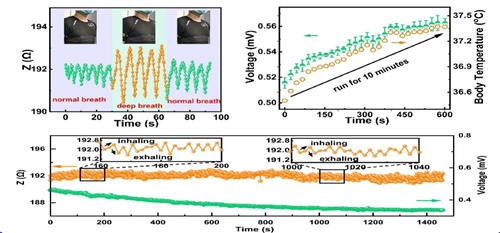 最后,该研究将所设计的管状线型双模传感器与织物集成,可以同时用于人体微小应变的探测,比如呼吸和吞咽等检测,也可用于膝盖弯曲等较大应变的探测,同时也能实现体温或环境温度的实时监测,在健康监测、智慧医疗以及人机交互领域具有良好的应用前景。