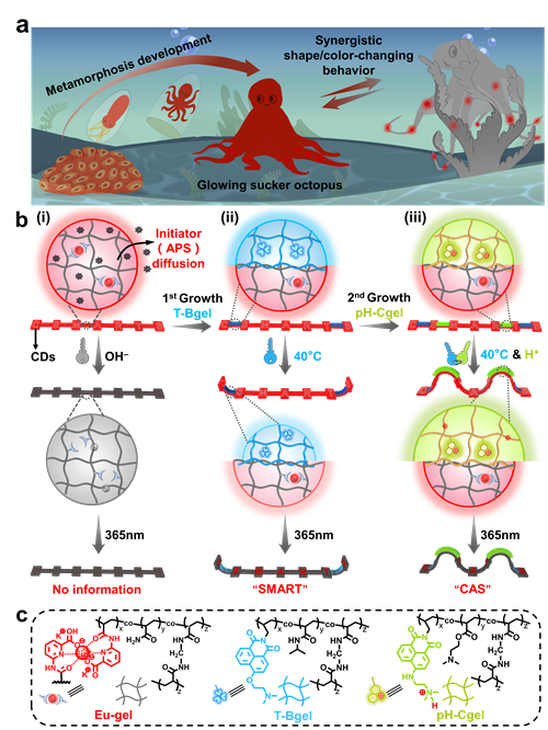 自然界中的许多生物进化出了能够编辑自身结构的卓越能力,以便在其生命周期内更有效地适应动态环境。例如海洋中的章鱼在出生后,手臂上会生长许多发光的吸盘,用来传递不同的生物信息,如惊吓捕食者或作为生物发光诱饵在黑暗的海洋中吸引猎物。长期以来,科学家尝试通过设计智能人工材料(尤其是类生物组织的软、湿高分子水凝胶驱动器)来复制这种自然结构编辑能力。这将极大丰富水凝胶驱动器的环境交互功能。然而在人工水凝胶体系中实现像真实生物一样在不同生长发育阶段具有不同的生物结构并展现不同的功能还是相当具有挑战性的。