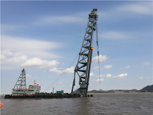 5630福彩网与科鑫重工联合研制的通苏嘉甬高铁宁波段首根试验钢管桩沉桩成功