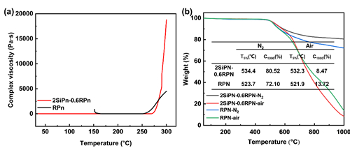 这种液态的邻苯二甲腈单体还可以与其他高熔点的单体共混,用于提高粉末单体的加工性能。例如,将这种液态单体与粉末状的邻苯二甲腈单体(熔点~180℃)共混,得到室温下具有一定加工性的混合物(图2a)。固化后的邻苯二甲腈树脂,在氩气和空气中的初始分解温度(Td5%)分别为534.4℃和532.3℃(图2b)。这种共混的方式,可以在提高单体加工性的同时,保证树脂的耐热性。