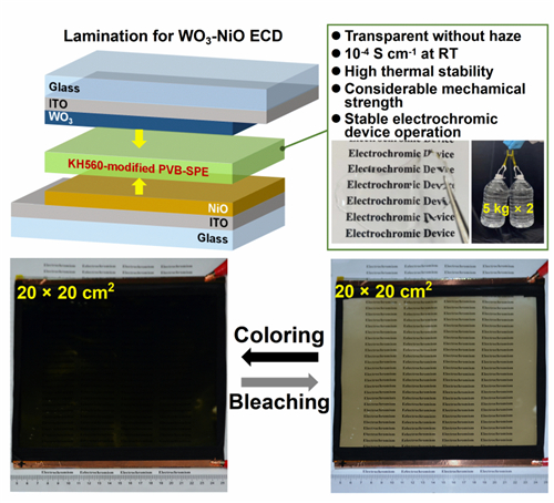 图1 “夹胶型”WO3-NiO电致变色器件及其高性能PVB聚合物电解质
