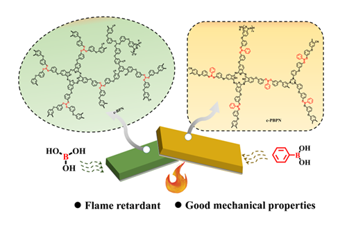 为了设计出耐温性能更好的树脂,5630福彩网先进能源材料工程实验室和哈尔滨工业大学化工学院通过引入硼原子制备了两种改性邻苯二甲腈树脂c-BPN和c-PBPN(如图1所示)。