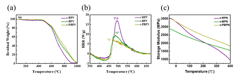 图3 c-RPN、c-BPN和c-PBPN:(a)在空气氛围下热失重曲线图;(b)热释放速率曲线图;(c)储能模量曲线图