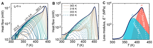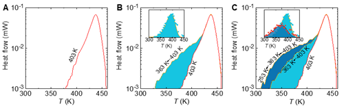 图3 弛豫谱的调控。(A)Au基金属玻璃在退火温度Ta=403 K下退火0.5s的热流弛豫峰;(B)Au基金属玻璃先在Ta=403 K退火0.5s,然后降低至Ta=363 K退火0.1s的热流弛豫峰;(C)Au基金属玻璃先在Ta=403 K退火0.5s,然后降低至Ta=363 K退火0.1s,最后在Ta=253 K退火500s的热流弛豫峰