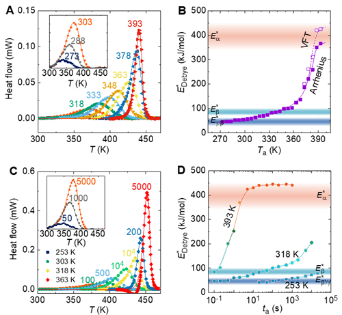 图2 弛豫谱的Debye模型分析。(A)Au基金属玻璃在退火温度Ta=273-393 K下退火5s的热流弛豫峰(实点)与Debye模型拟合(实线);(B)A图中退火条件下的弛豫激活能;(C)Au基金属玻璃在退火温度Ta=253,303,318,363 K下退火不同时间的热流弛豫峰(实点)与Debye模型拟合(实线);(D)C图中退火条件下的弛豫激活能