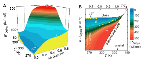 图4 不同弛豫模式在焓空间中的演化规律。(A)激活能随退火温度和弛豫焓变的关系;(B)不同弛豫模式演化的温度-焓变相图