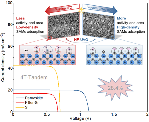 图1 基于ITO表面重构的四端钙钛矿/硅叠层太阳电池的J-V曲线和ITO表面重构前后的微观形貌及表面化学变化图
