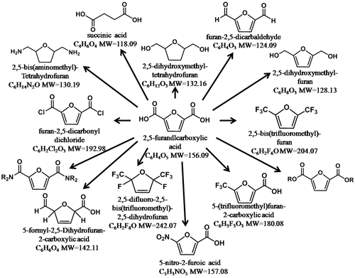 2,5-呋喃二甲酸(FDCA)是近十年来国内外重点研发的生物基芳环化合物,据已有文献报道,石化基苯环二酸产品均可使用生物基呋喃类化合物FDCA替代合成,且其衍生物众多(如图1),苯环产品作为亿吨级产品,其市场价值巨大,因此,FDCA作为生物碳产品,具有碳减排属性,受到了广泛关注。
