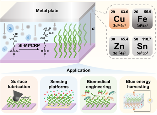 针对以上问题,中国科学院宁波技术与工程研究所界面功能高分子材料团队在张涛研究员带领下长期从事表面引发可控自由基聚合方法学及其应用研究,开发了一系列零价金属介导的SI-Mt0CRP,并探究了高效、大面积制备功能性聚合物刷薄膜及其在质子传输、生物医学、防污防冰、海洋能源收集等领域的潜在应用(Polym. Chem., 2015, 6, 2726;Polym. Chem., 2015, 6, 8176;Angew. Chem. Int. Ed. 2018, 57, 16380;Nat. Commun. 2018, 9, 4051; ACS Macro Lett. 2019, 8, 145; Chem. Eur. J. 2020, 26, 2749; Polym. Chem. 2020, 11, 6971;ACS Macro Lett. 2020, 9, 328;ACS Macro Lett. 2022, 11, 296; ACS Macro Lett. 2022, 11, 693; ACS Macro Lett. 2023, 12, 71; ACS Appl. Mater. Interfaces, 2023, 15, 41193)。SI-Mt0CRP通过零价金属片直接做催化剂和还原剂源,能够在大气环境中温和的实验条件下实现大面积聚合物刷的高效可控制备;并且还具有单体消耗量大幅减少、聚合速率显著提高等优点,因而吸引了领域内广大研究者的关注。近日,该团队受邀在Accounts of Chemical Research发表题为“Surface-Initiated Zerovalent Metal-Mediated Controlled Radical Polymerization (SI-Mt0CRP) for Brush Engineering”的综述文章(Acc. Chem. Res. 2023, 56, 2329-2340. DOI: 10.1021/acs.accounts.3c00310),并选为当期封面文章(图1)。该综述系统总结了零价金属(如Cu、Fe、Zn和Sn)介导表面引发可控自由基聚合方法(SI-Mt0CRP)的特点及机理,介绍了其在聚合物刷制备及应用领域的研究进展(图2),并展望了其未来的挑战和发展方向。