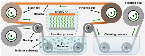 尽管经过大量的研究,SI-Mt0CRP技术得到了长足的发展,但仍然存在一些问题和挑战亟需解决。未来需要进一步加深对其机理更全面深入的分析研究,例如,通过非线性光谱电化学或电化学石英晶体微天平(EQCM)等原位表征技术揭示各种金属催化剂和配体的聚合机制。最后,为了实现聚合物刷薄膜的大规模生产以及推动其在实际工业应用中的发展,作者提出了一种概念性的卷对卷加工工艺流程(图4),为未来聚合物刷工程化应用提供了思路和借鉴。