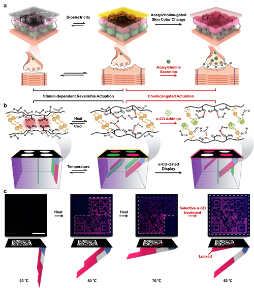 近年来,通过对头足类动物皮肤的解剖分析,研究人员逐渐了解其核心的变色机制。如图1a所示,头足类动物会将感受到的外界刺激转换为生物电信号,并通过神经递质传递到包裹色素细胞的径向肌肉细胞膜上。这些生物电信号会触发径向肌肉的舒张/收缩,从而带动色素细胞(红色与绿色色素细胞)发生体积变化,实现皮肤颜色的动态变化。除此之外,依据对环境需求的分析,头足类动物还会在体内定点释放神经抑制剂(乙酰胆碱)来重置膜电位,精准地使某些包裹色素细胞的径向肌肉细胞失活,进而阻碍局部色素细胞(红色色素细胞)的收缩,以实现对皮肤颜色的定制化控制。值得一提的是,一段时间后,这些分泌的乙酰胆碱会被代谢吸收,使肌肉细胞重新恢复变形能力。正是依靠色素细胞周围肌肉组织的独特化学门控驱动策略,头足类动物得以在不改变自身色素细胞排列与组成的情况下,基于“电触发-肌肉驱动-色素细胞变形”的方式实现皮肤的多色化与图案化以适应环境的动态变化。因此,在人工信息系统中,设计开发类似的门控单元以实现“单输入-多输出”及动态/静态协同的模式,对于现有信息显示及加密过程具有重大的科学意义。