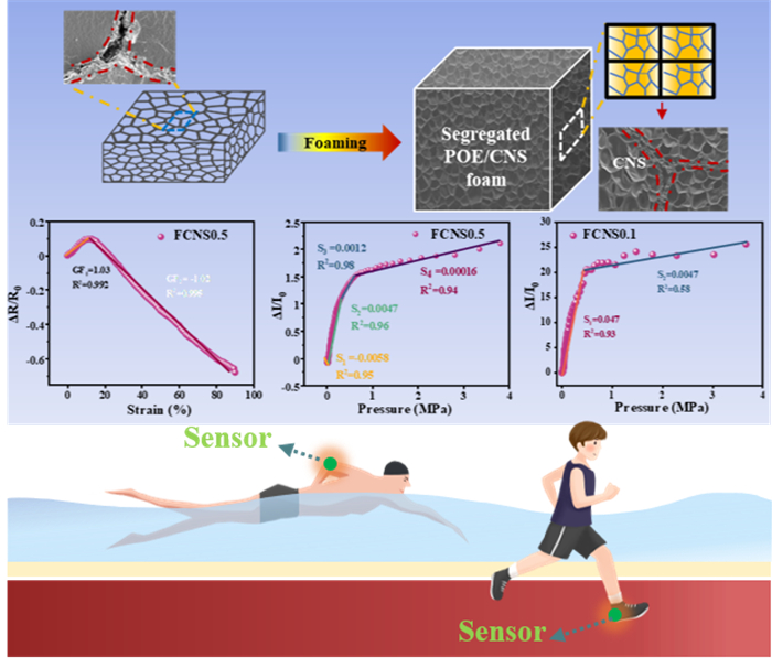 柔性可穿戴传感器能够实时监测各种人体信号,在运动检测、健康管理等领域具有重要价值。以往的研究表明,具有多孔结构的传感器可以显著提高其响应灵敏度,并赋予其更高的可压缩性。因此,泡沫压阻传感器已受到研究人员的广泛关注。然而,制备这些泡沫传感器的方法(如3D打印、冷冻干燥、模板法和浸涂法等)复杂、耗时且不环保。此外,基于气凝胶和海绵的传感器通常灵敏度低、抗压强度差,检测范围有限。超临界二氧化碳发泡是一种新的、环境友好的方法,但由于导电复合材料过高的熔体强度,难以获得高孔隙率的压阻泡沫以改善其工作范围。因此,通过绿色手段制备宽响应范围、高灵敏度的泡沫压阻传感器面临巨大挑战。