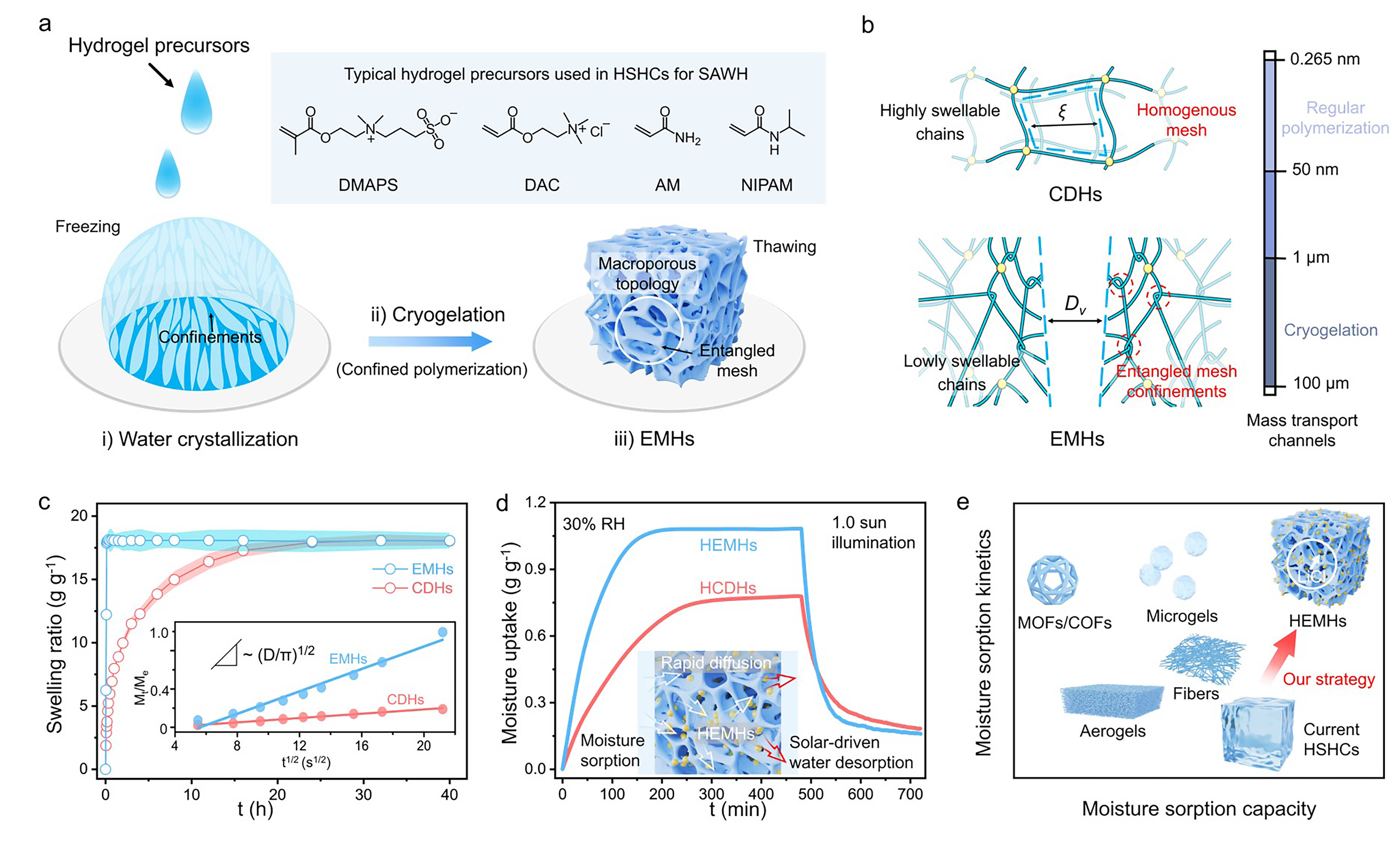 首先,将凝胶前驱液在低温下冻结,使其内部形成大量相互连接的冰晶,与此同时,前驱液中的溶质由于冰晶的限制作用自发地聚集形成了许多微域。随着聚合反应的进行,微域中拥挤的单体逐渐形成高度缠结的网状聚合物骨架。随后将冷冻凝胶在室温下解冻,制备得到具有互连、开放的大孔拓扑结构的EMHs(图1a)。值得注意的是,这种方法具有普适性,适用于当前HSHCs中常用的各种单体,包括DMAPS、DAC、AM、NIPAM等,以制备EMHs,进而提供了极大的材料选择多样性。与常规聚合法制备的致密水凝胶(Coventional Dense hydrogels,CDHs)中的网格尺寸(ξ< 50 nm)相比,由于EMHs中许多高度缠结微区的形成并表现出受限溶胀的特性,因此在其微区之间产生了大量微米级的大孔拓扑结构(图1b)。这种拓扑结构之间的差异进而导致了两者在质量传输特性上的显著不同。实验证明,EMHs表现出比CDHs更快的溶胀动力学特性(图1c)。进一步,在凝胶中加入氧化石墨烯(GO)和氯化锂(LiCl),制备得到具有优异光热转换性能的吸湿性 EMHs(HEMHs),其在典型的干旱气候条件下(30% RH,1.0 kW m-2)表现出优异的吸湿动力学和太阳光驱动的脱湿动力学性能(图1d)。其性能优于吸湿性CDHs(HCDHs)和报道的各类用于SAWH的吸附剂(图1e)。