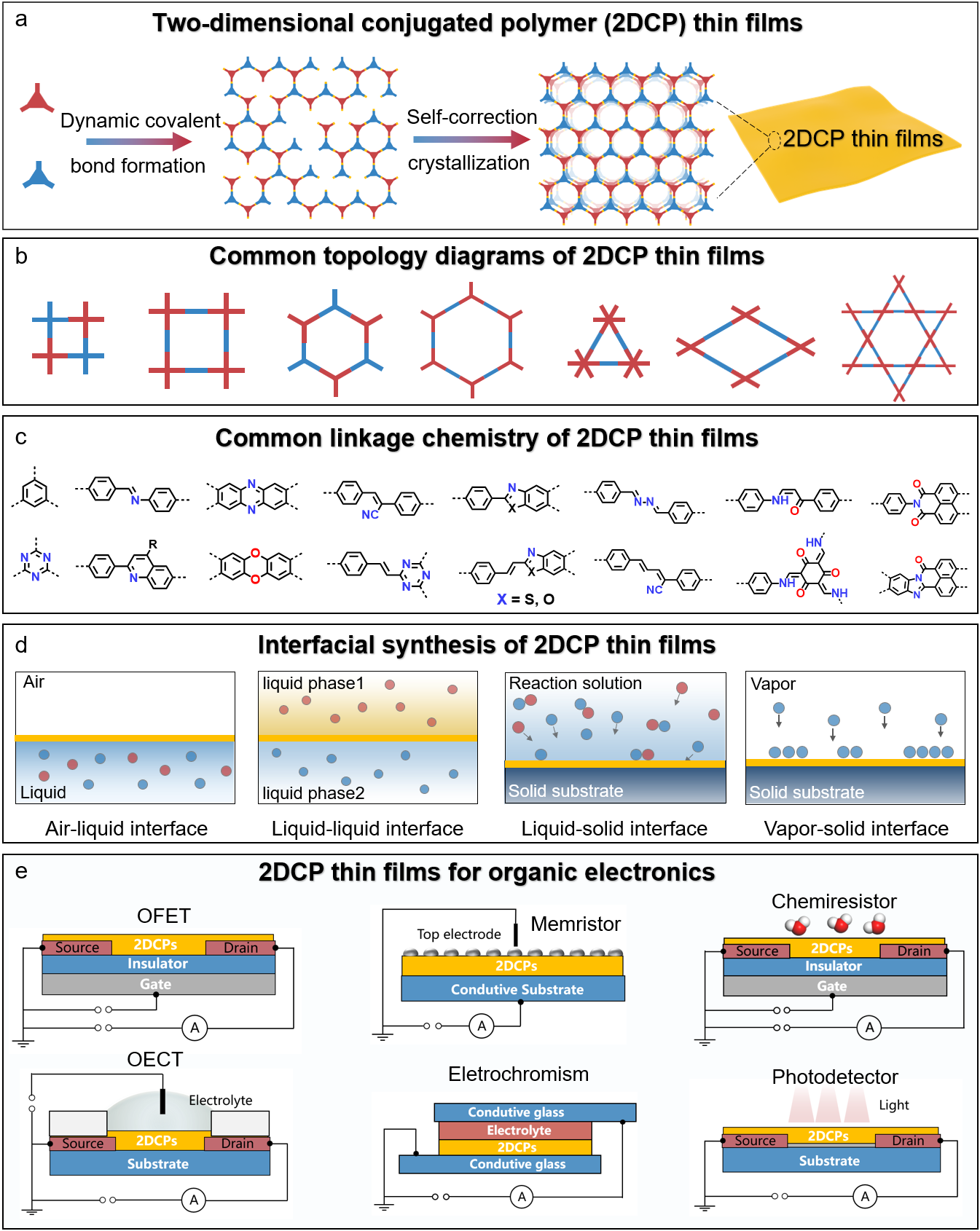 图2 2DCPs薄膜的常见拓扑结构、连接键化学、界面合成策略和有机电子应用