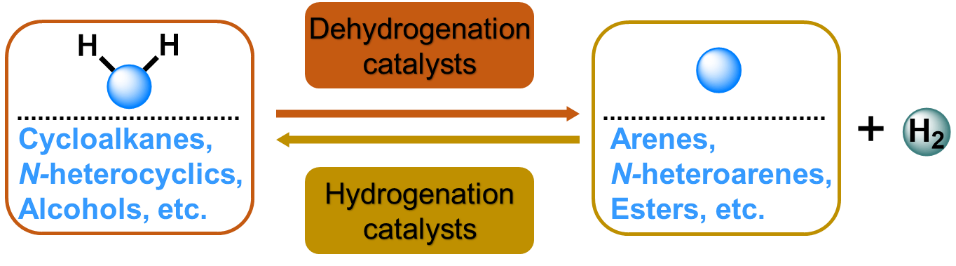 作者在文中详细讨论了烷烃类、氮杂烷烃类和醇类液态有机氢载体的储氢密度、物理性质与热力学常数,全面概括了目前已报道的均相和非均相催化剂的设计原理,制备方法和催化剂的活性、选择性与稳定性等关键问题,展望了未来液态有机氢载体的低成本制备方法、低价高效催化剂的设计原理、光/电催化储/放氢反应的能源效率优势以及在车载氢技术中构建储/放氢一体化反应的必然性。