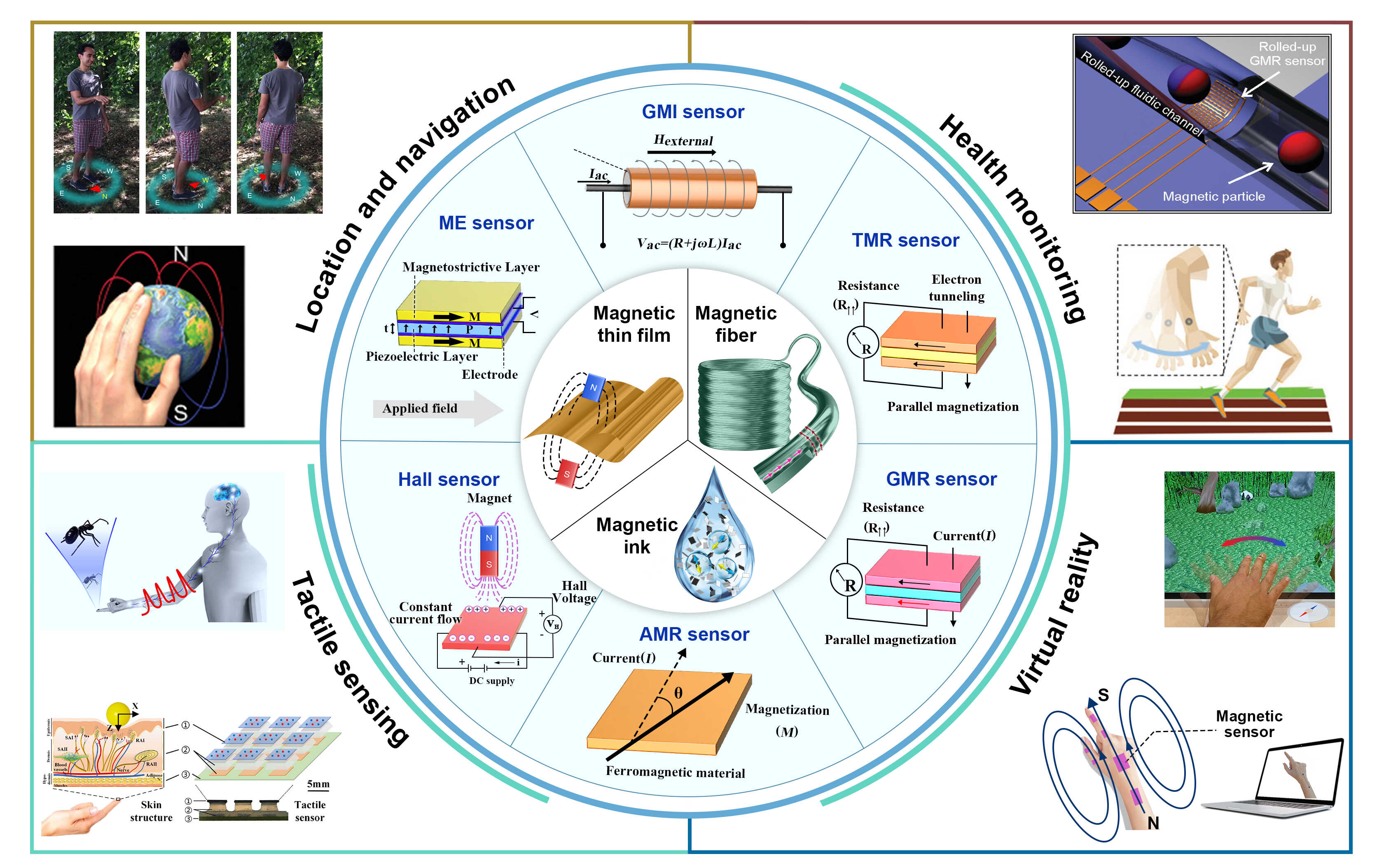 柔性电子器件具有柔软和可变形等机械灵活性,能够适应各种曲面和复杂形状,在可穿戴技术、医疗保健、物联网和消费娱乐等领域具有重要应用。柔性磁敏传感器作为一类独特电子器件的代表,结合了柔性电子器件的机械柔韧性和磁传感元件的非接触探测特性,在可穿戴应用领域展现出巨大潜力。例如:将柔性磁传感器集成到可穿戴设备中,可以提供定位和导航功能;磁敏电子皮肤可用于监测心率、呼吸模式和肌肉活动,为理疗、运动训练和医疗保健提供有价值的数据;可穿戴磁敏手套允许用户通过手部运动控制各种设备,为虚拟现实(VR)和增强现实(AR)应用提供重要方案。