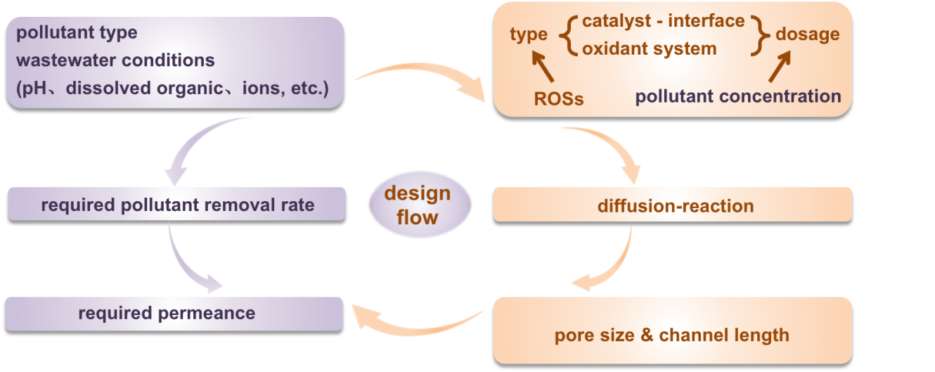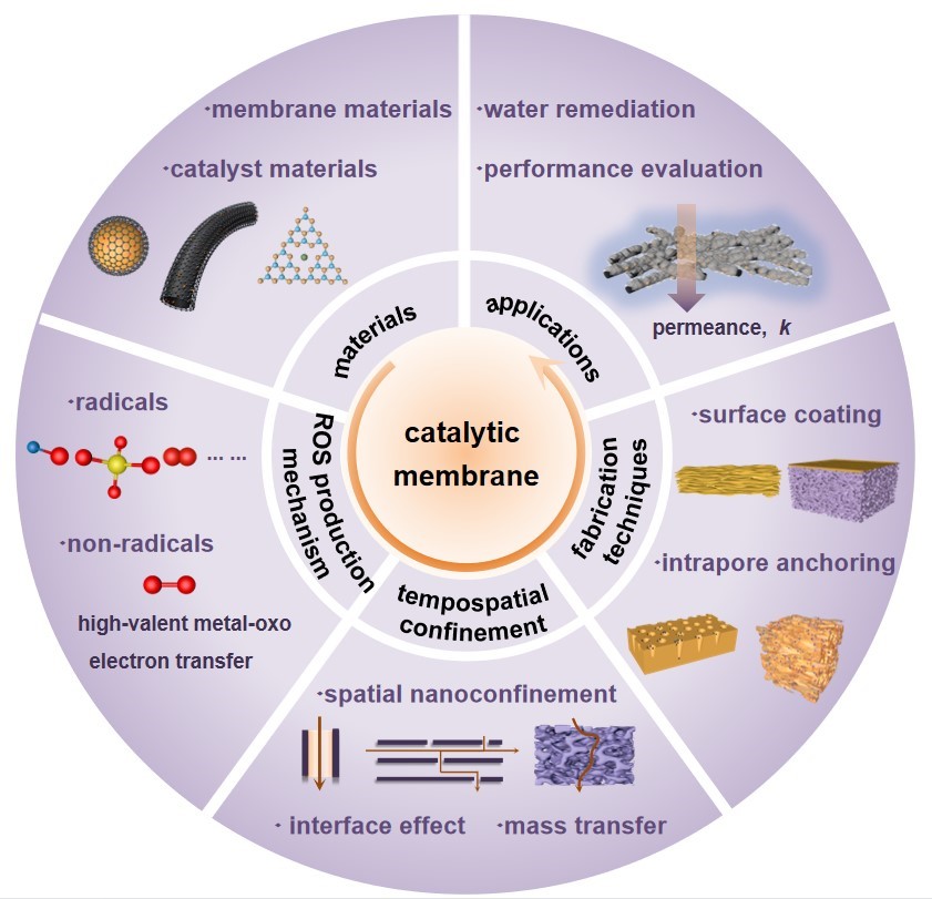 水资源再利用是缓解全球水资源压力和应对淡水短缺问题的关键策略。将膜、过滤过程与异相高级氧化过程耦合制备催化膜,提供了具有高效、选择性、连续性的污水治理新途径。膜孔纳米限域效应可提升催化反应热力学和动力学,并促进孔通道内反应物的传质过程,对实现污染物的即时催化降解具有重要意义。然而,最优的膜孔空间限域尺度无法确定,纳米级限域通道可能导致催化膜渗透性和催化降解性能之间的trade-off。而且孔中反应物连续的扩散-反应过程使得催化降解效率与时间和空间密切相关,但目前膜孔时空限域效应对催化膜性能的影响尚未明确。同时,催化膜的构效关系模糊,未形成针对具体应用的催化膜设计标准,阻碍了催化膜的实际工程应用。因此,全面了解用于水治理的催化膜的组成、制备、限域机理并提出定向设计准则至关重要。