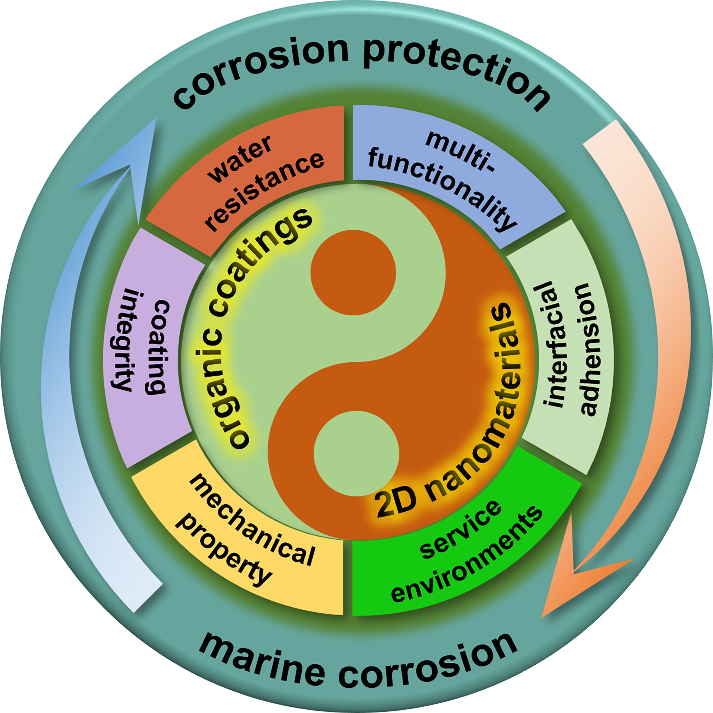 金属腐蚀问题遍及国民经济的众多领域,据统计,我国每年因腐蚀造成的经济损失高达2万亿元,其中,海洋腐蚀损失约占总腐蚀损失的三分之一。防腐涂料是保障海洋工程与机械装备安全服役的关键材料,但传统鳞片型防腐涂料存在尺寸大、厚度高、添加量大、与树脂基体相容性差等问题,已达到使役性能极限,在海洋苛刻环境服役过程中易出现开裂、剥离失效等问题,无法满足海洋复杂环境下的防腐需求。新型二维片层纳米材料因其大的比表面积、高的化学稳定性和超强的物理阻隔等特性,成为发展海洋长效防腐涂层的关键材料之一。特别是通过对新型二维片层纳米材料改性防腐涂层的多尺度表界面设计能够赋予涂层特种功能,可有效提升海洋装备的长寿命安全稳定服役性,在海洋复杂腐蚀环境下表现出巨大的应用前景。