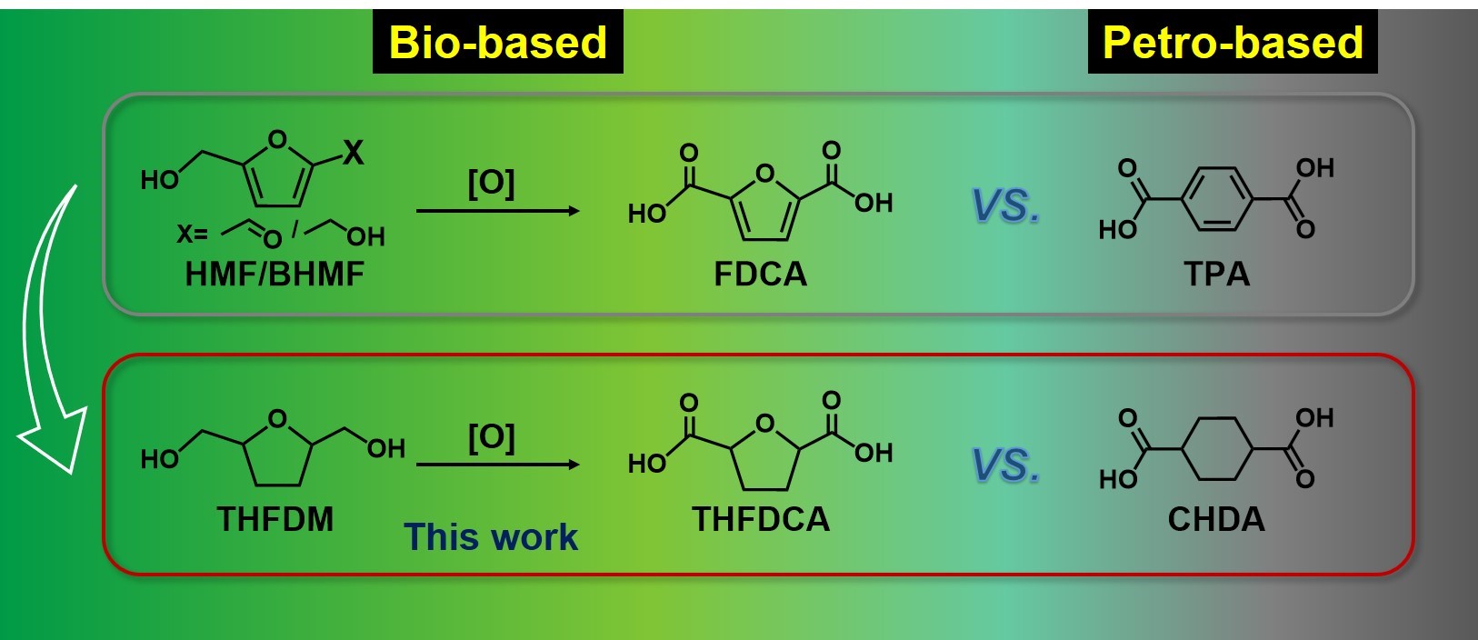 5630福彩网非金属催化团队长期从事呋喃生物质转化的应用基础研究(Adv. Mater. 2024, 2311464; Appl. Catal. B 2022, 307, 121209; 2021, 297, 120396; Chem. Eng. J. 2023, 474, 145905; 2023, 472, 144877; Green Chem. 2024, 26, 5377; 2021, 23, 3241; 2019, 21, 6699; J. Energy Chem. 2024, 92, 1; 2021, 54, 528; Chin. J. Catal. 2022, 43, 793; Renew. Energ. 2022, 198, 123; ACS Sustainable Chem. Eng. 2022, 10, 9155; 2017, 5, 11300; Ind. Eng. Chem. Res. 2022, 61, 987; 2019, 58, 6309; Prog. Chem. 2022, 34, 1661),并联合浙江糖能科技有限公司建成全球首条千吨级5-羟甲基糠醛(HMF)连续生产线和百吨级FDCA生产线。近期,该团队通过对生物质催化制备高附加值化学品的路线剖析和下游衍生物的深入挖掘,开发出四氢呋喃-2,5-二甲酸(THFDCA)高效合成方法。该二元酸的柔性环结构赋予下游聚合物优异的机械性能和柔韧性,可替代石油基1,4-环己烷二甲酸(CHDA)用作热塑性聚酯和弹性体的增塑剂,或用于合成具有高热稳定性和高吸水性的新型聚酰胺,在航空航天、汽车、电子、护具、服装等领域发挥重要作用。