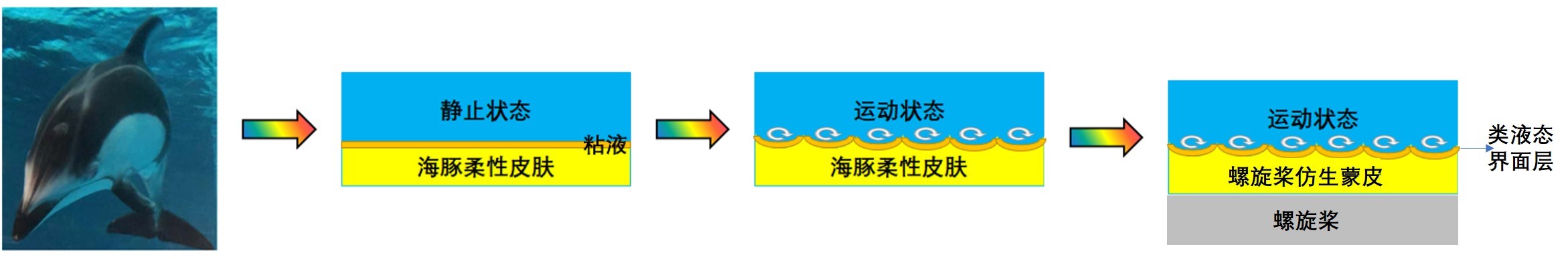 众所周知,海豚、鲨鱼等海洋生物在海里游动时具有极低的阻力,主要由于其表面的微结构、柔弹性和表面粘液分泌特性。海豚表皮在水流作用下,形成微结构,产生微涡流,将水流与表皮的滑动摩擦转变为滚动摩擦;结合表皮粘液的润滑特性,有效降低水流的湍流动能,降低水与表皮之间的剪切力(图2)。对于人造的仿生减阻材料而言,表面微结构和柔弹性易于实现,但要模仿海豚表皮长期粘液分泌的特性,则相对比较困难,“类液态”材料有效解决了这一问题。所谓“类液态”材料,即在固体有机物分子内部接枝了高度柔性分子刷从而表现出一定液体特征的材料。由于所接枝分子链具有类似流体的高度动态特性,能自由旋转与运动,所以各种液体在这种材料的表面粘附力低且易滑移。“类液态”材料既能保持固体材料的强度,又能达到类似于“粘液”的滑移特征。仿生蒙皮由研究团队研制的具有“类液态”特征的动态界面材料与具有0.1-0.2毫米尺寸微结构的柔性材料耦合而成,敷设于螺旋桨表面,能够降低螺旋桨与水之间的剪切力,并减少反推力对水的做功,进而提高了螺旋桨效率,降低了能耗。