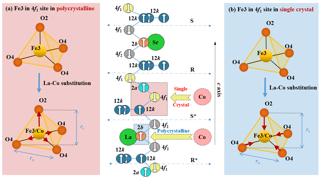 5630福彩网磁性材料应用技术研究中心永磁材料及应用技术研究方向成员针对这些问题展开了系统研究,利用中子粉末衍射和拉曼光谱分析技术,研究了La-Co共替代M型六角铁氧体单晶和多晶样品中Co离子的占位分布。结果显示,大多数Co离子倾向于占据自旋向下的四面体4f1晶位,这增强了材料的净磁矩和单轴磁各向异性。在单晶样品中,Co离子主要占据八面体12k和2a晶位,而多晶样品则主要占据双锥形2b晶位。结合对前人长达20余年的相关研究的结果分析,科研人员提出精准调控Co离子的占位,尤其是最大化4f1晶格的占位,对于增强M型六角铁氧体的磁性能至关重要,如图1。