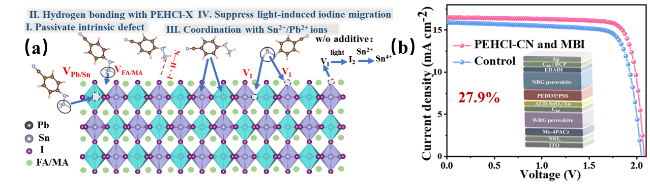 图1(a)苯肼体系添加剂的作用机制;(b)全钙钛矿叠层太阳能电池器件效率及其结构图