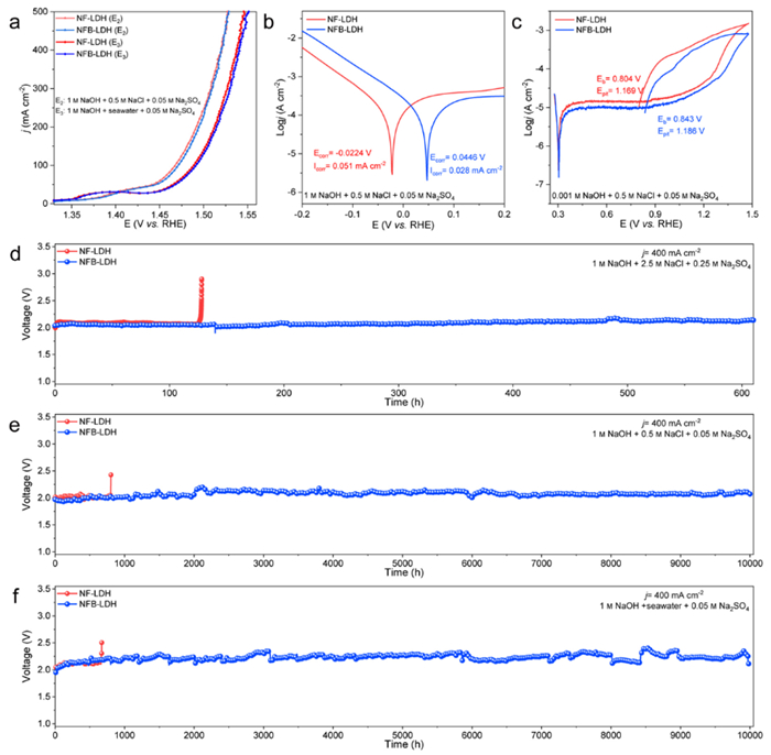 图1 (a-c) NiFe-LDH和NFB-LDH在碱性电解液和海水中的活性和耐腐蚀性;(d-f) NiFe-LDH和NFB-LDH在不同电解液中的稳定性