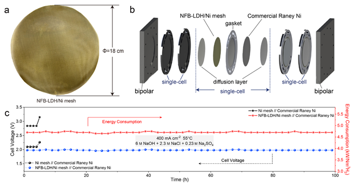 图2 (a-b) NFB-LDH放大电极及电解槽示意图;(c) NFB-LDH放大电极在1kW电解槽中能耗及稳定性