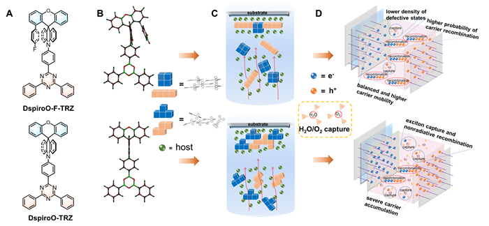 图 (A) DspiroO-F-TRZ和DspiroO-TRZ的分子结构;(B)优化的分子构型;(C)类俄罗斯方块堆积示意图;(D) 载流子注入、传输和复合特性