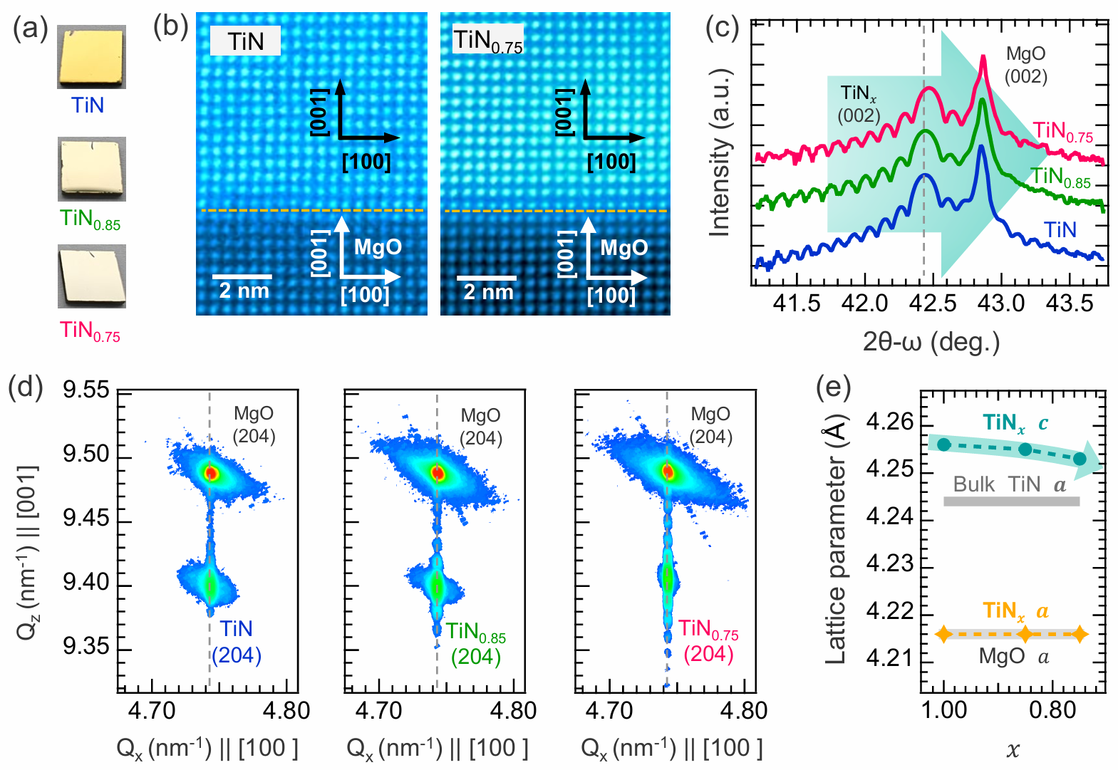 图 具有不同氮空位浓度的TiN单晶薄膜:(a) 实物图;(b) 原子级透射电镜图;(c)高分辨X射线衍射扫描;(d) 倒易空间成像;(d) 薄膜与衬底的晶格常数
