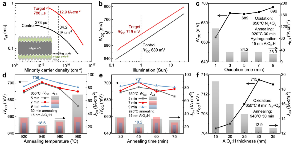 该工作的创新点及重要性在于,通过改善绒面氧化硅的完整性、优化硼扩散曲线、提升氧化铝注氢质量等策略,显著提升了p型TOPCon的钝化质量。具体来说,常规的双面对称寿命片的单面饱和电流密度(J0,s)和隐含开路电压(iVoc)分别是34.2 fA/cm2和689 mV;优化后的p型TOPCon,寿命片的J0,s和iVoc分别为12.9 fA/cm2和715 mV;双绒面TOPCon底电池的开路电压从690 mV大幅提升至710 mV。该工作目前所获TOPCon底电池相关技术指标处于行业内先进水平。