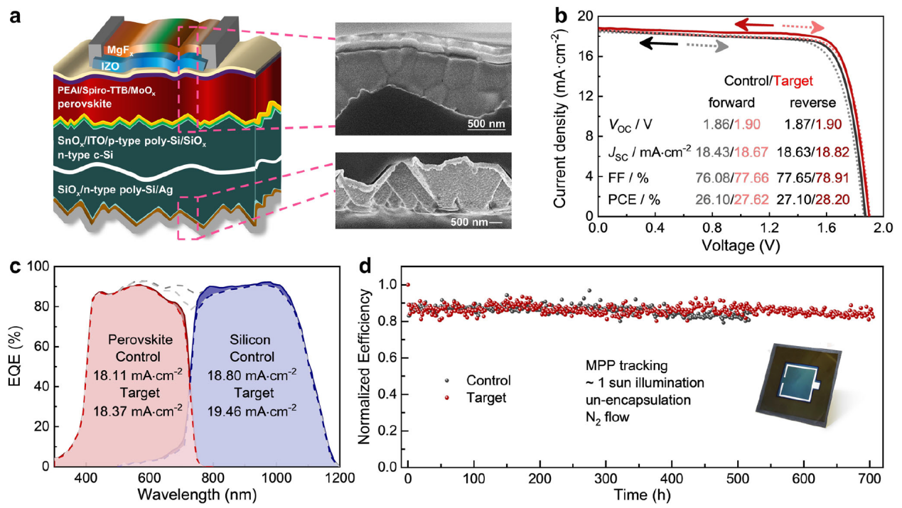 进一步,团队将该TOPCon底电池与钙钛矿顶电池集成,成功制备出n-i-p型正式钙钛矿/硅两端叠层太阳电池(1 cm2),获得超过1.9 V的开路电压和28.20%的效率(认证效率为27.3%),显示出该体系具有开发高效叠层电池及组件的潜力。