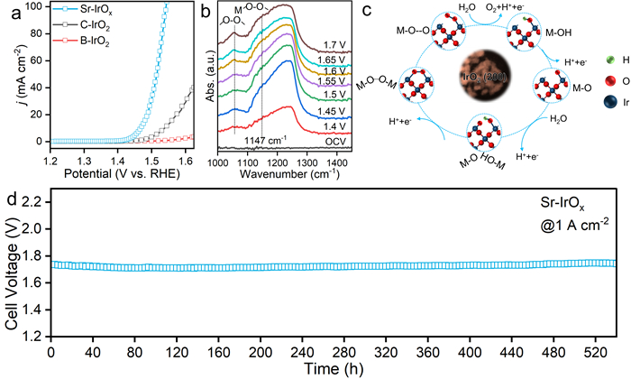 5630福彩网氢能与储能材料技术实验室王宇楠研究员、陆之毅研究员及其团队成员,共同合作利用碱土金属氧化物(Sr(OH)2)作为模板及元素掺杂剂,首次成功制备了铱基OPM型催化剂Sr-IrOx,即(200)晶面高度暴露的锶掺杂IrOx(如图1),提升了PEM中阳极氧化反应的效率和稳定性。得益于IrO2(200)面上高密度可用的相邻铱位点,以及锶对Ir-O共价性的有效调控,Sr-IrOx能够在酸性水氧化过程中促进直接氧-氧耦合,绕过生成*OOH中间体的高能屏,实现在酸性环境下高效稳定的OER。在质子交换膜电解水器件中,Sr-IrOx在1A cm-2电流下可稳定工作超500小时(如图2)。Sr-IrOx电催化剂的优异性能为未来大规模的酸性水电解制氢应用奠定了坚实的基础,有望推动氢能生产技术的商业化进程。
