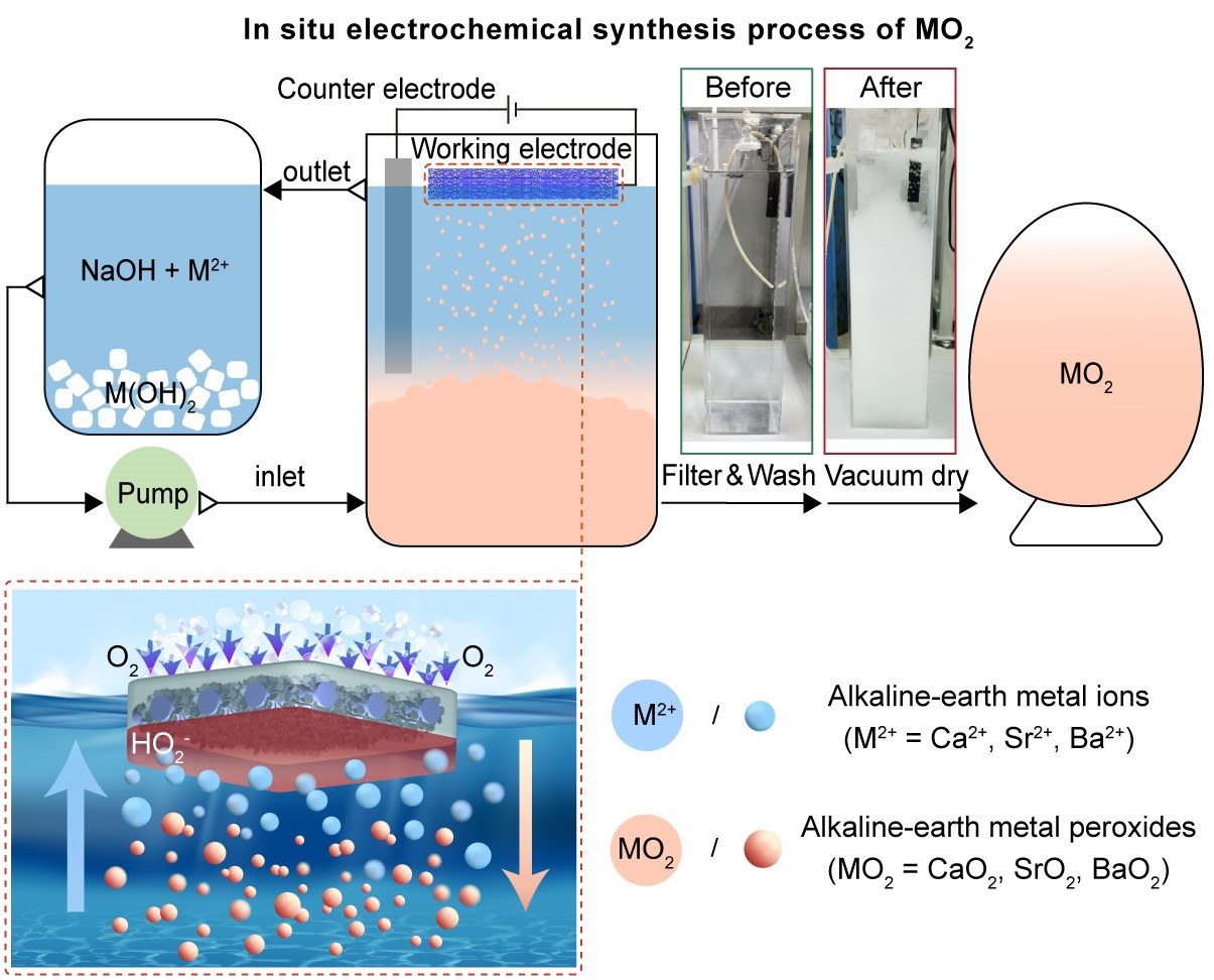 碱土金属过氧化物(MO2,包括CaO2、SrO2和BaO2)作为过氧化氢(H2O2)的衍生物,同样具有强氧化性,但其作为固体物质,相比于H2O2具有更稳定的化学性质,在漂白、废水处理、消毒和精细化学品合成等领域应用广泛。目前,工业上主要采用高浓度H2O2与碱土金属氢氧化物反应来生产MO2,这种传统的化学合成方法存在着原料(H2O2)运输危险、生产成本高、产物纯度低等问题,直接制约了MO2的普及和发展。近些年来,为避免高浓度H2O2运输和储存引起的风险,研究人员提出了电化学在线生产的方法,即利用电化学二电子氧还原反应(2e- ORR)在线生产H2O2,无需运输即可直接用于化学合成MO2。然而,由于电化学合成的H2O2在累积过程中易发生自分解反应,导致生产效率较低。