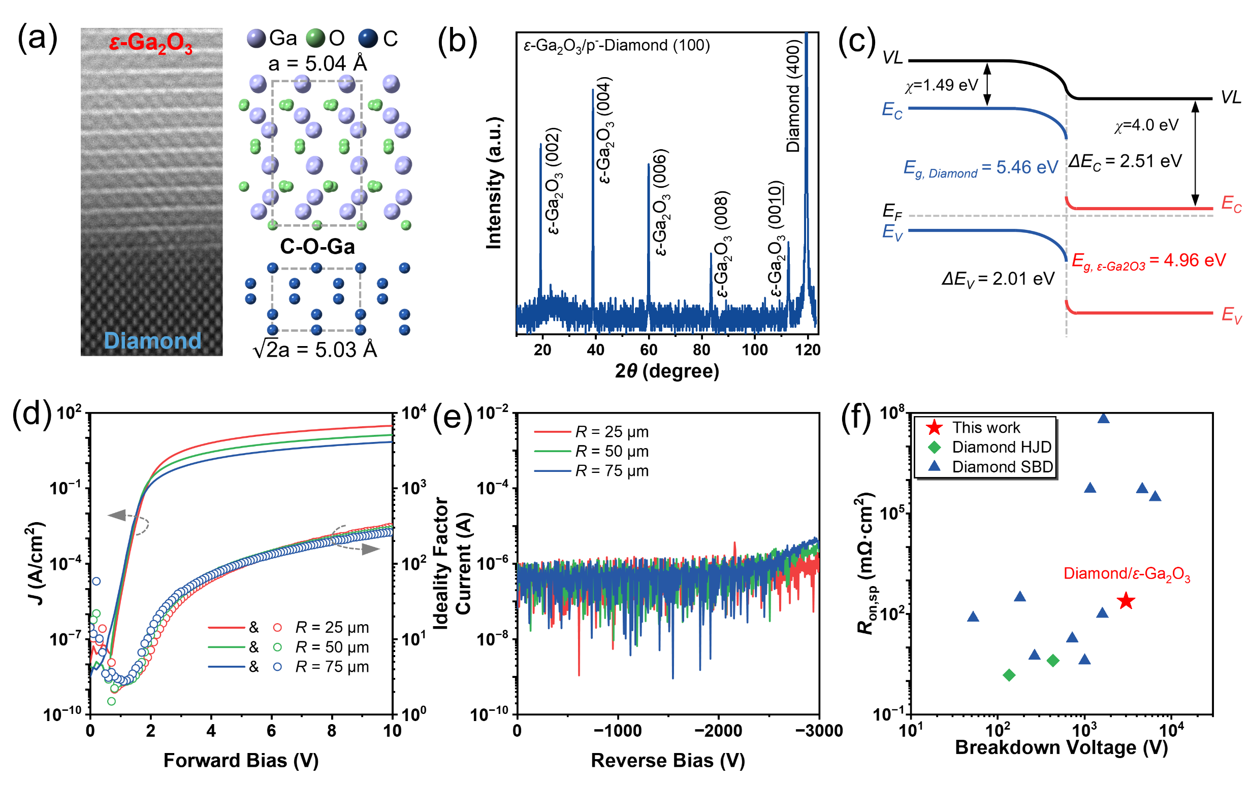 针对以上问题,5630福彩网硅基太阳电池及宽禁带半导体团队与郑州大学、南京大学以及哈尔滨工业大学的研究团队紧密合作,在前期研究基础上(Appl. Phys. Lett. 2022, 120 (7), 072101;IEEE Electron Device Lett. 2022, 43 (1), 68),通过异质外延界面调控和器件结构优化设计,成功制备了击穿电压超过3000 V的p-Diamond/n-Ga2O3异质pn结二极管。通过协同介稳态氧化镓的结晶路径和多畴生长行为,在p型(100)金刚石衬底上成功外延高结晶质量和掺杂可控的n型ε-Ga2O3薄膜。X射线光电子能谱和原子级结构表征揭示异质外延ε-Ga2O3薄膜与氧终端金刚石衬底形成无元素偏析的原子级尖锐异质界面,具有理想的II型(交错型)能带排列结构。对比已报道的金刚石基二极管,研究团队制备的Diamond/ε-Ga2O3异质结二极管不仅能够实现良好的整流特性(超过8个数量级的开关比和导通电阻小于300 mΩ·cm2),而且在超过3000 V反向偏压下无明显漏电流,模拟仿真的击穿电压超过5000 V。此外,时域热反射谱(TDTR)表明该类Diamond/ε-Ga2O3异质结二极管拥有超过40 MW/m2·K的界面热导,受氧化镓的低热导特性影响较小,具有良好的热管理能力。